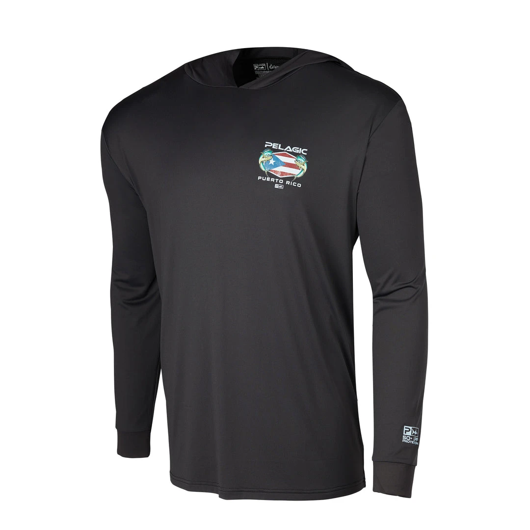 - Paying homage to Puerto Rico with dolphin fish graphics surrounding the Puerto Rican flag, stamped with the Pelagic logo