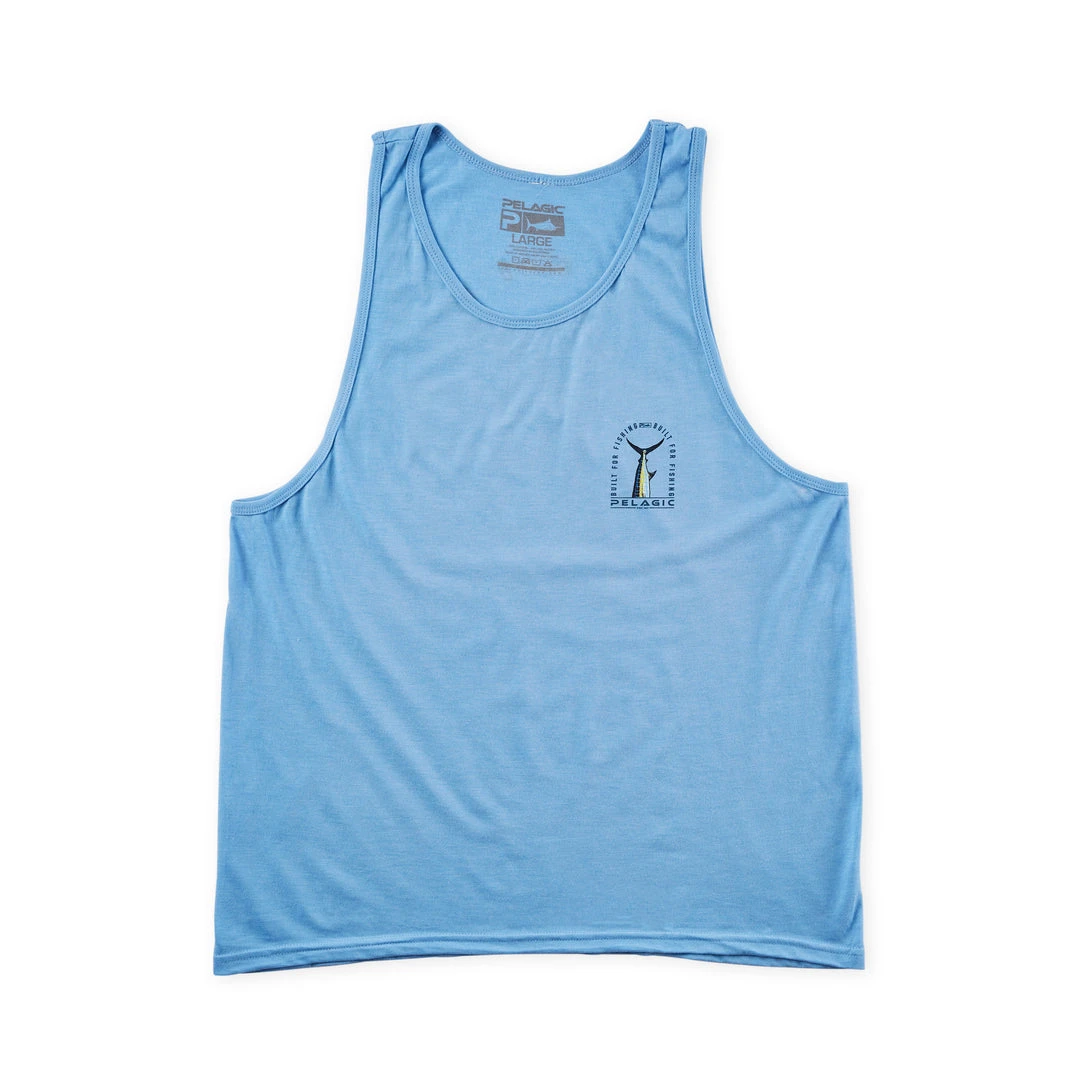 Made of an ultra-soft, tri-blend, cotton-poly fabric with Rayon synthetic fibers, this tank offers the ultimate comfort fit for your lifestyle on or off the water. Featuring a large blue marlin fishtail graphic on the back.