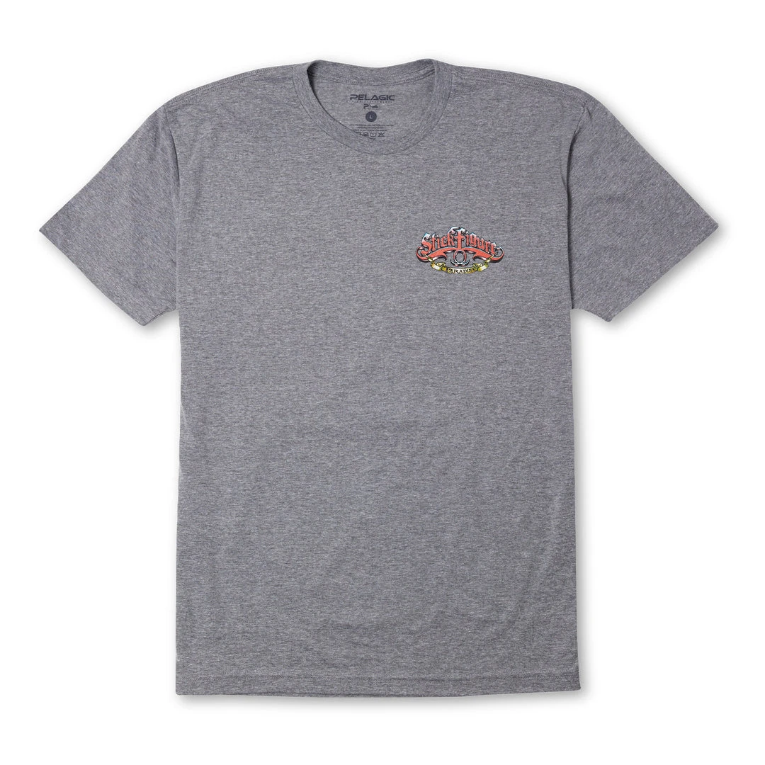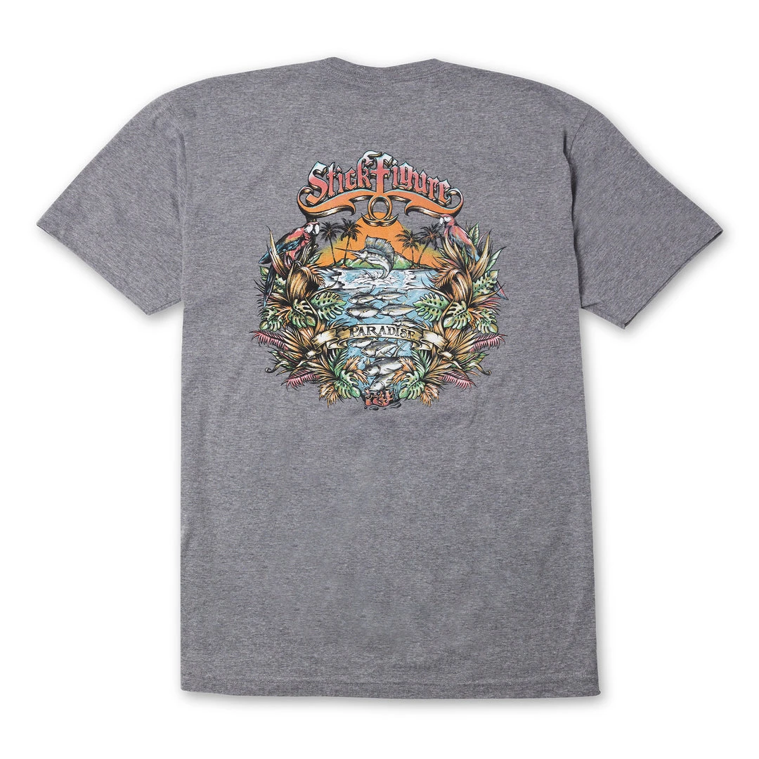 This limited-edition ultra-soft Tri-Blend tee features custom Pelagic x Stick Figure “Paradise” graphics with large print on back and front-left chest logo.