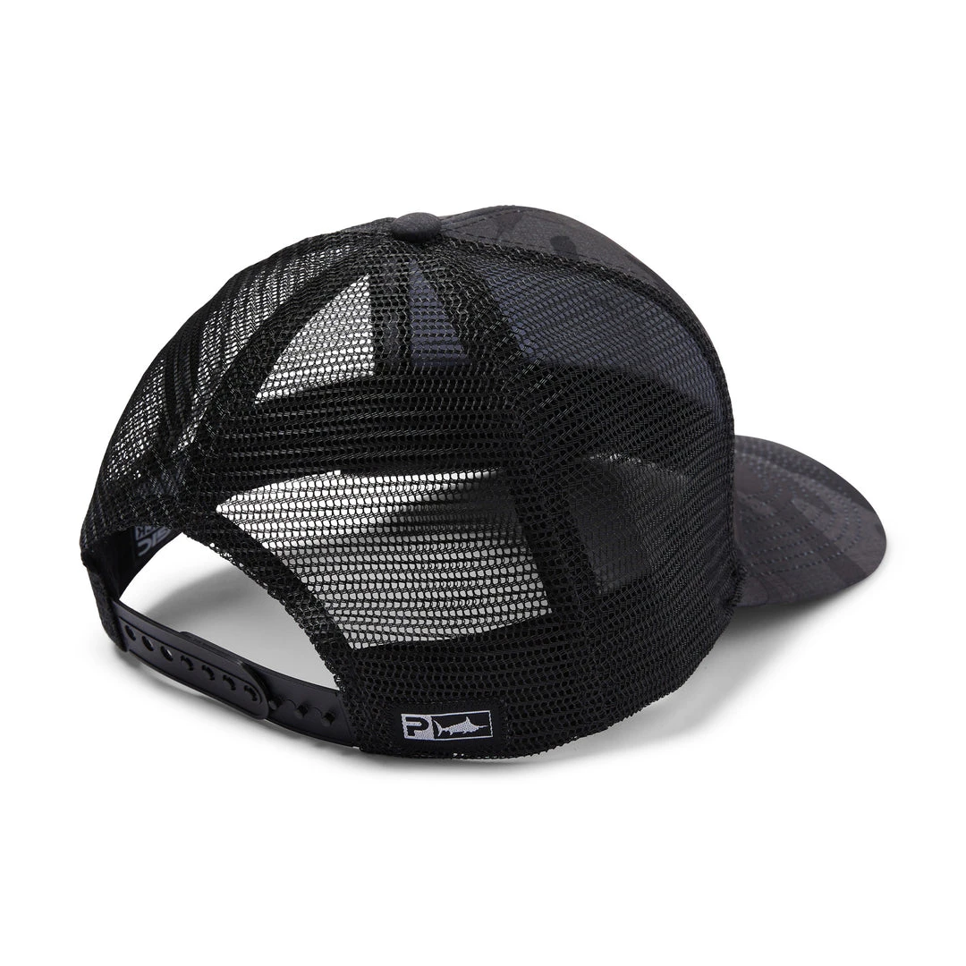 - Trucker hat featuring a front embroidered game fish tuna patch