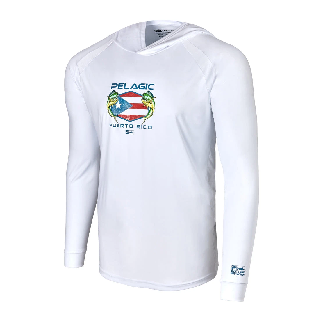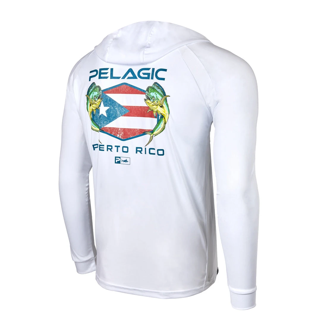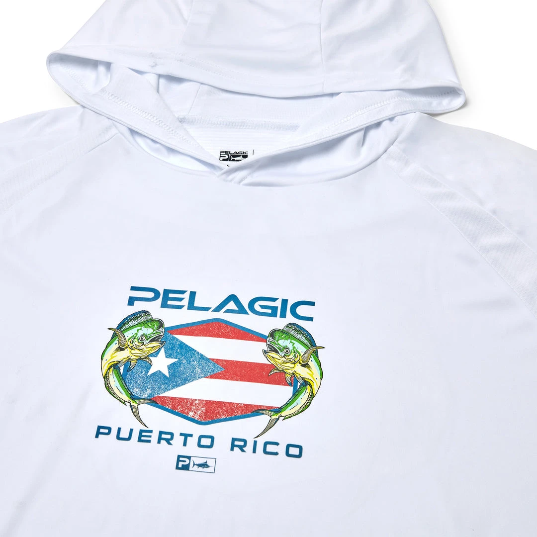 - Paying homage to Puerto Rico with dolphin fish graphics surrounding the Puerto Rican flag, stamped with the Pelagic logo