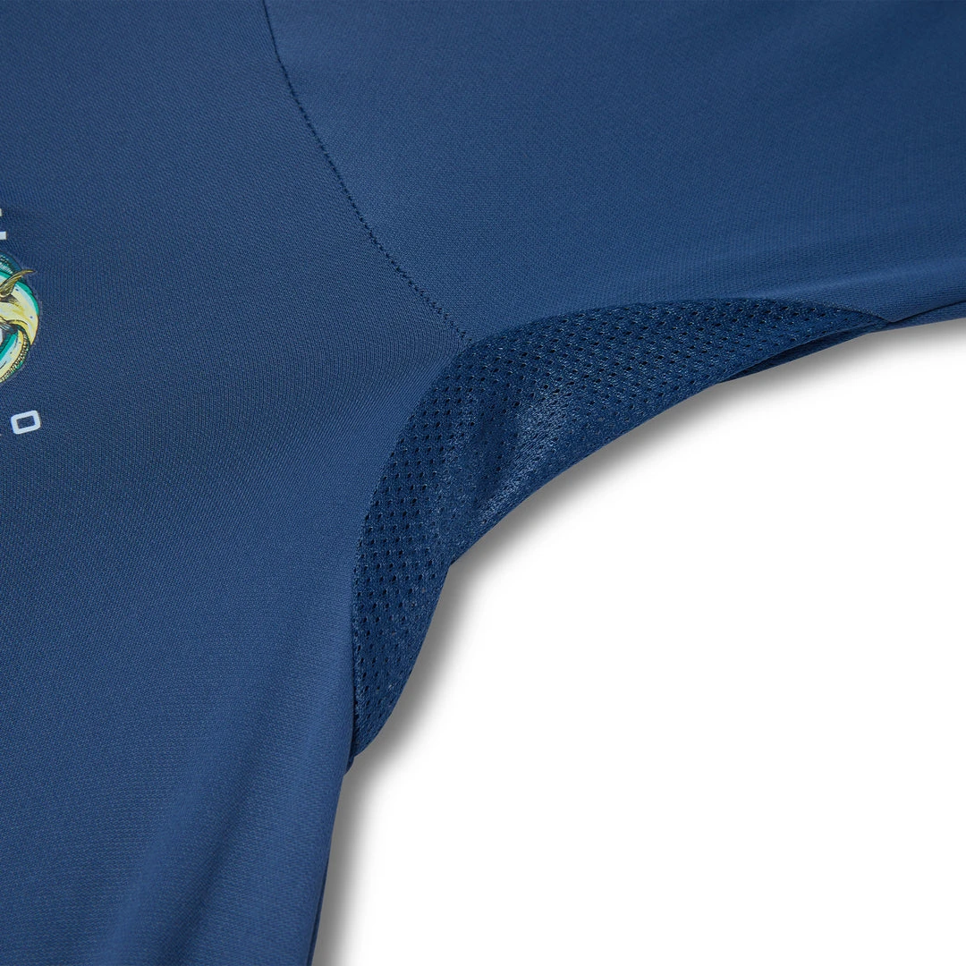 • Paying homage to Puerto Rico with dolphin fish graphics surrounding the Puerto Rican flag, stamped with the Pelagic logo